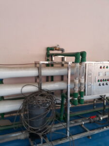 The RO system removes dissolved salts, heavy metals, microorganisms, organic compounds, hardness, and conductivity, producing clean water for industrial use. Applications: boilers, cooling systems, beverage production, electronics, chemical blending.